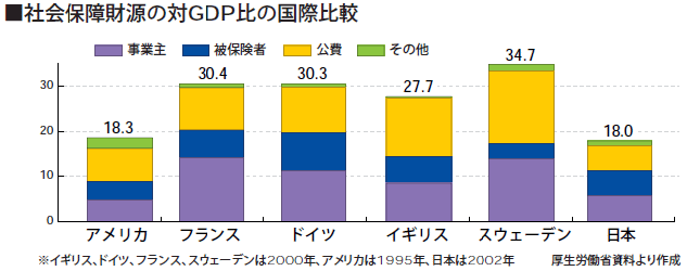 世界のGDP比で社会保障給付費の割合を比較すると、日本はかなり低い水準となっており、公的医療保険が未整備であるアメリカと同水準となっています。