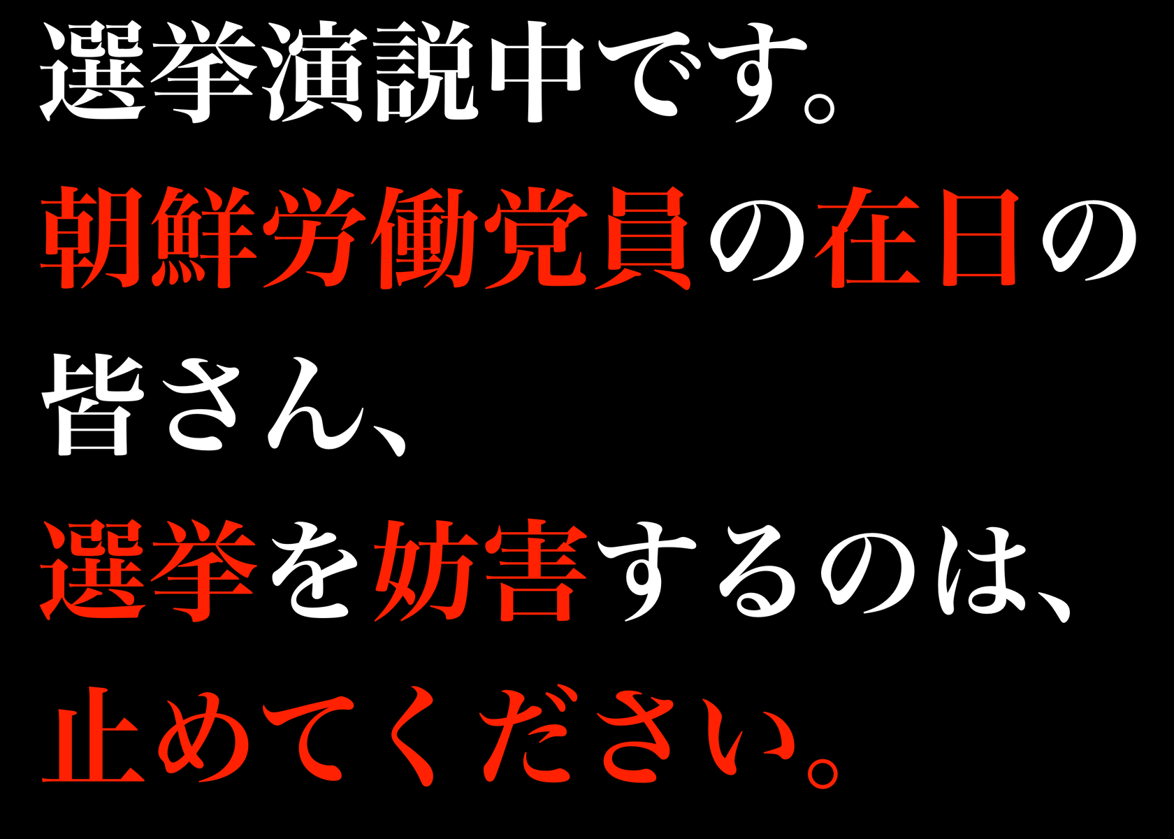 ⑥できれば、その間有権者向けに被害にあっているプラカード(冒頭にあるもの)を掲げて、税金免除や朝鮮部落利権の外国人参政権が欲しい在日特権組民や、革新破壊の共産党参加の市民団体(男女共同参画費で税金を浪費して働いてない人たち)から、彼らの利権を粉砕するために戦う日本第一党候補者が、被害を受けている構図をわかってもらう。