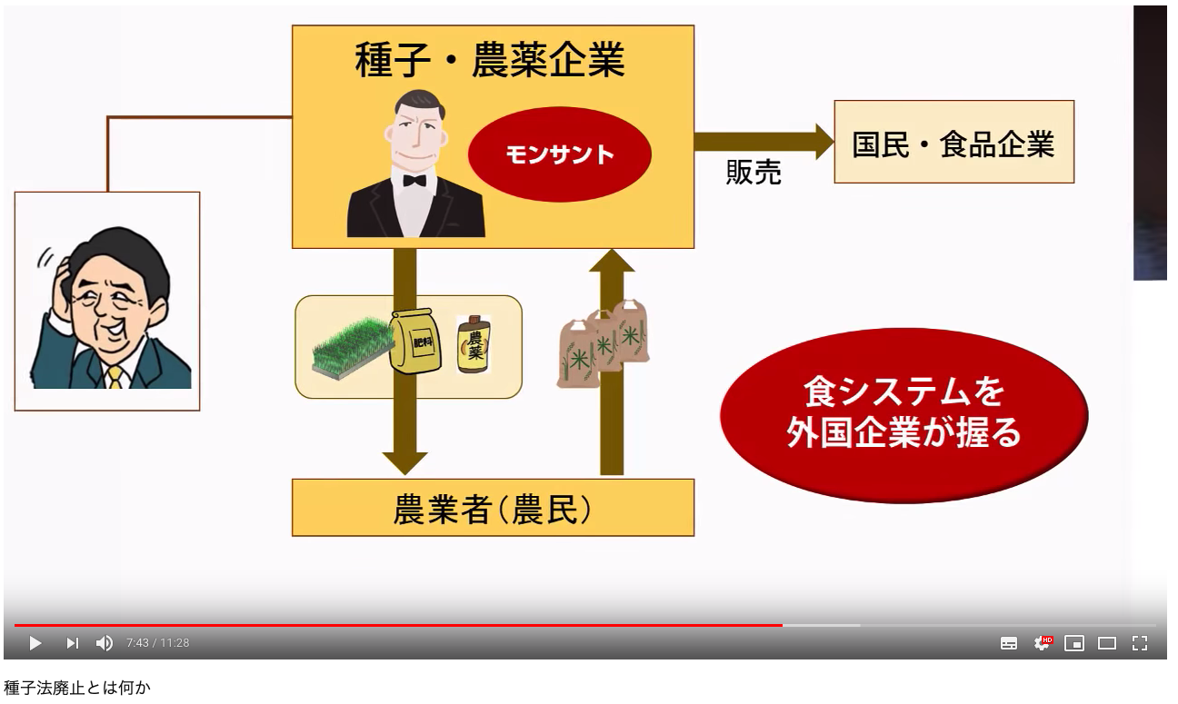 ただ、日本には農協がいて、我々モンサント社が参入できるよう規制緩和で農協を壊していただきたい。ついでに種子法も廃止したから、日本の財産とも言えるブランド米、ブランドのイチゴ、そのほか高品質の日本が開発してきた種を我々に販売権をください。
