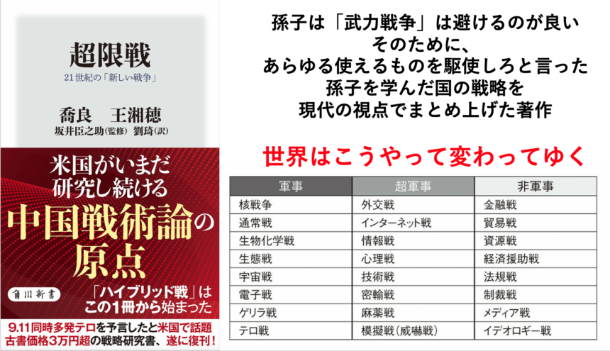 ということで最近三木谷がうろついたり、外資がうろついたりしたわけですが、誰が郵政を民営化して解体してバラ売りしたのかといえば、竹中平蔵です。小泉は馬鹿で何言っているかわからなくてただ暴れたいだけだったので、竹中平蔵としては使いやすかったんだと思いますね。ひろゆきとの対談で、構造を改革するには強い政治家が必要だといっていた。今はいないそうです。というか馬鹿な政治家を集めても日本が自滅するのが早まるだけですので、どうせなら竹中平蔵は、自分が死ぬまでは日本は持ってくれる侵略されることはないと思っているんだと思いますね。ですが、コロナで想定外の進捗がありました。尖閣を抑え第一列島線を抑え、台湾をいつ攻めるかの段階において、コロナ新株をチャイナはばら撒くでしょう。ファイザーなどに情報を投げ、国際金融資本とは良好の関係を気付き、アメリカが守れない状態にして、国内テロに見せかけ、香港のように武装警官が町都市を占拠し、一瞬で台湾は占拠されるでしょう。これがウクライナをあっという間にロシア編入した事例で学ぶ超限戦、つまりハイブリッド戦です。どこまでが軍事でどこまでまでが民事かわからないので、正規なルートで対応ができないという混乱した事態で実効支配する。