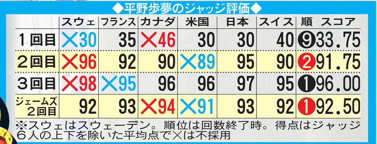 それでも平野選手はこの時点で火がついたわけですけれおども、やはりフランスとスイスの95点という点数の低さには呆れますね。100点を出してもいいわけですけれども。その時代の最高難易度を、こういった差別により、低く採点されたことが、いままで平野選手が金を取れてもおかしくなかったということが、浮き彫りになったわけでして、平野選手も、僕よりもみんなが怒ってくれていて感謝しているということですので、日本の宝を守っていかなければなりませんね。